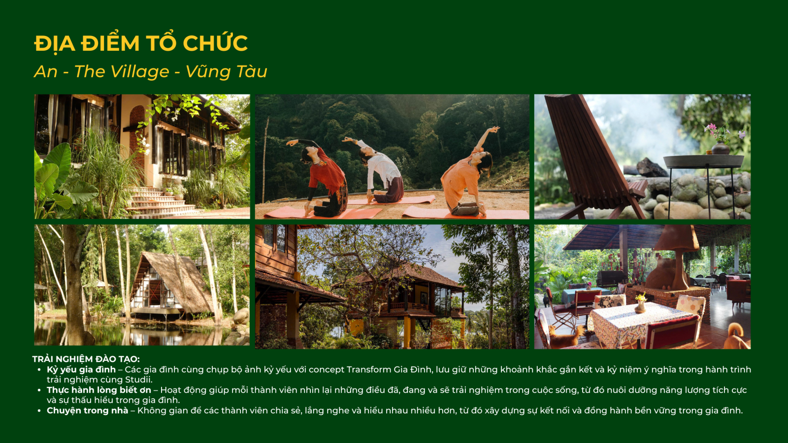 An - The Village là nơi nghỉ dưỡng thiết kế theo lối kiến trúc mộc mạc, mang không gian tĩnh lặng hòa cùng thiên nhiên xanh mát, tách biệt nhịp sống đô thị. Được Studii lựa chọn làm địa điểm tổ chức Transform Gia Đình, nơi đây mang đến bầu không khí trong lành, cảnh quan gần gũi với thiên nhiên và không gian sinh hoạt ấm cúng – tạo điều kiện để các gia đình thực sự chậm lại, kết nối sâu sắc và cùng nhau trải nghiệm hành trình thấu hiểu, đồng hành và phát triển.